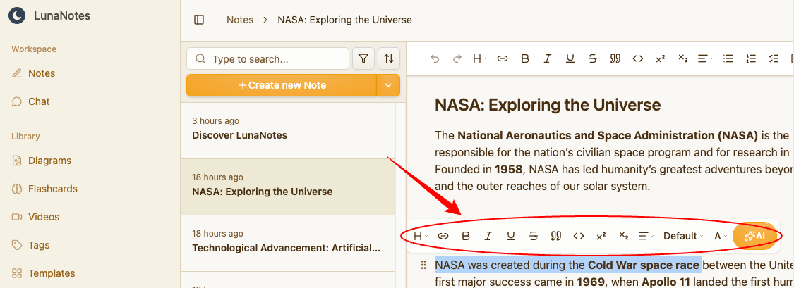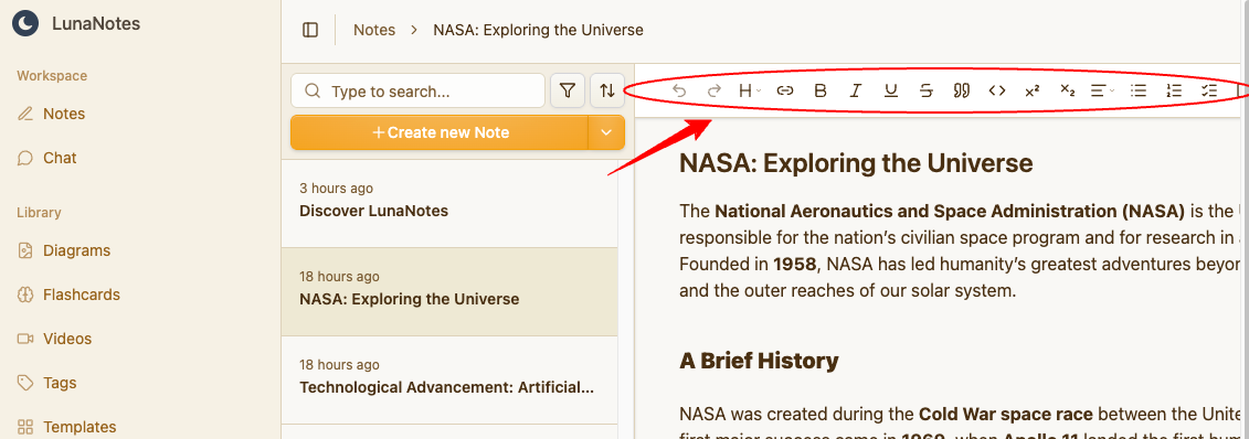 LunaNotes includes two toolbars that help you edit quickly and efficiently: