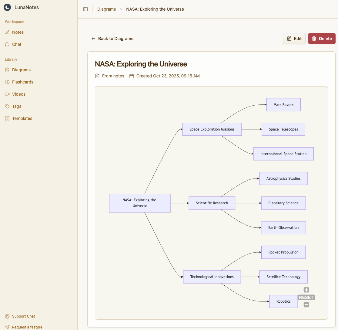 LunaNotes allows you to generate diagrams from your existing notes using AI. This feature analyzes the text content of your selected note(s), detects key concepts and their relationships, and automatically creates a visual diagram—helping you understand and organize your ideas faster.