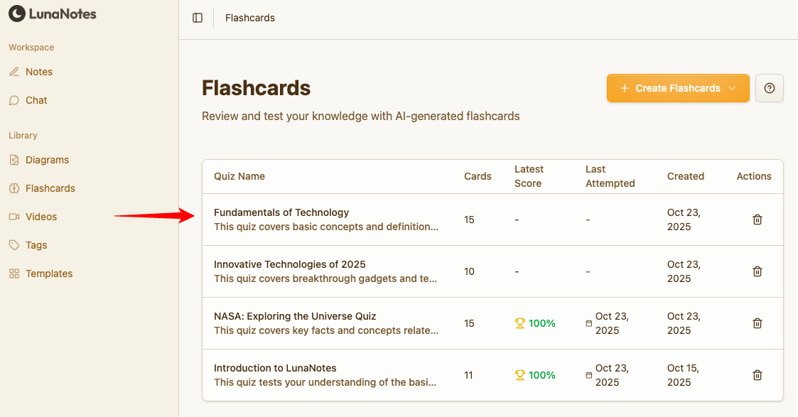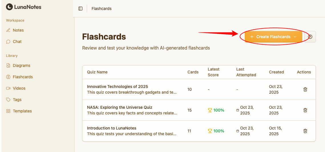 From your LunaNotes workspace, click 📇 Flashcards in the left sidebar.