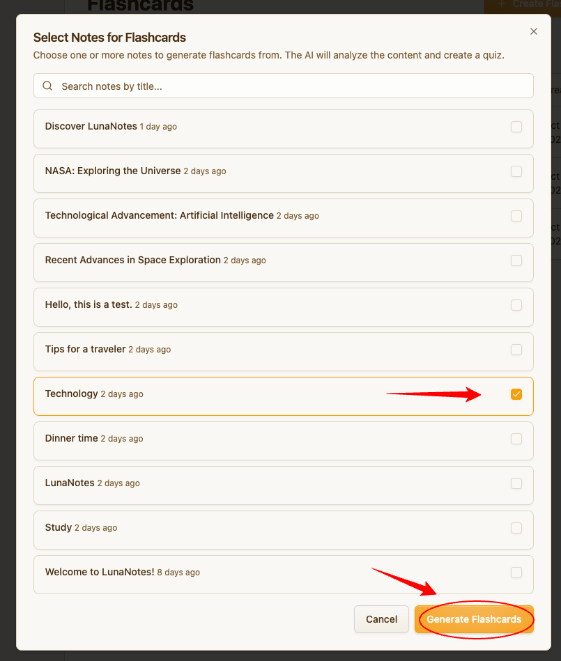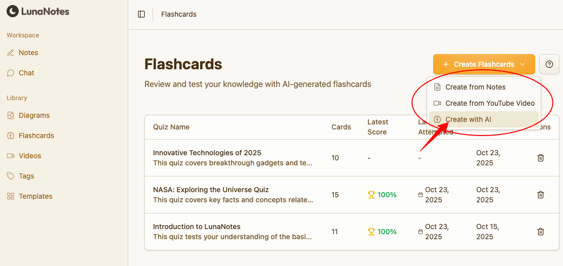 LunaNotes lets you create flashcards automatically using AI based on your existing notes.