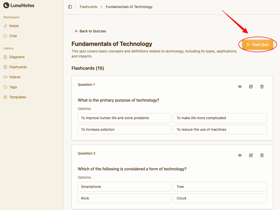 How to Start a Flashcard Quiz in LunaNotes →