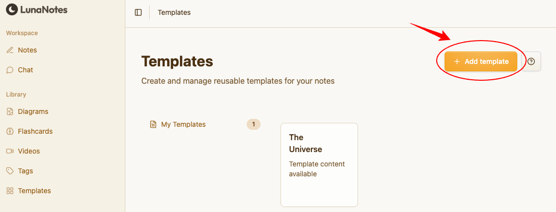 From your LunaNotes workspace, click 📄 Templates in the left sidebar.