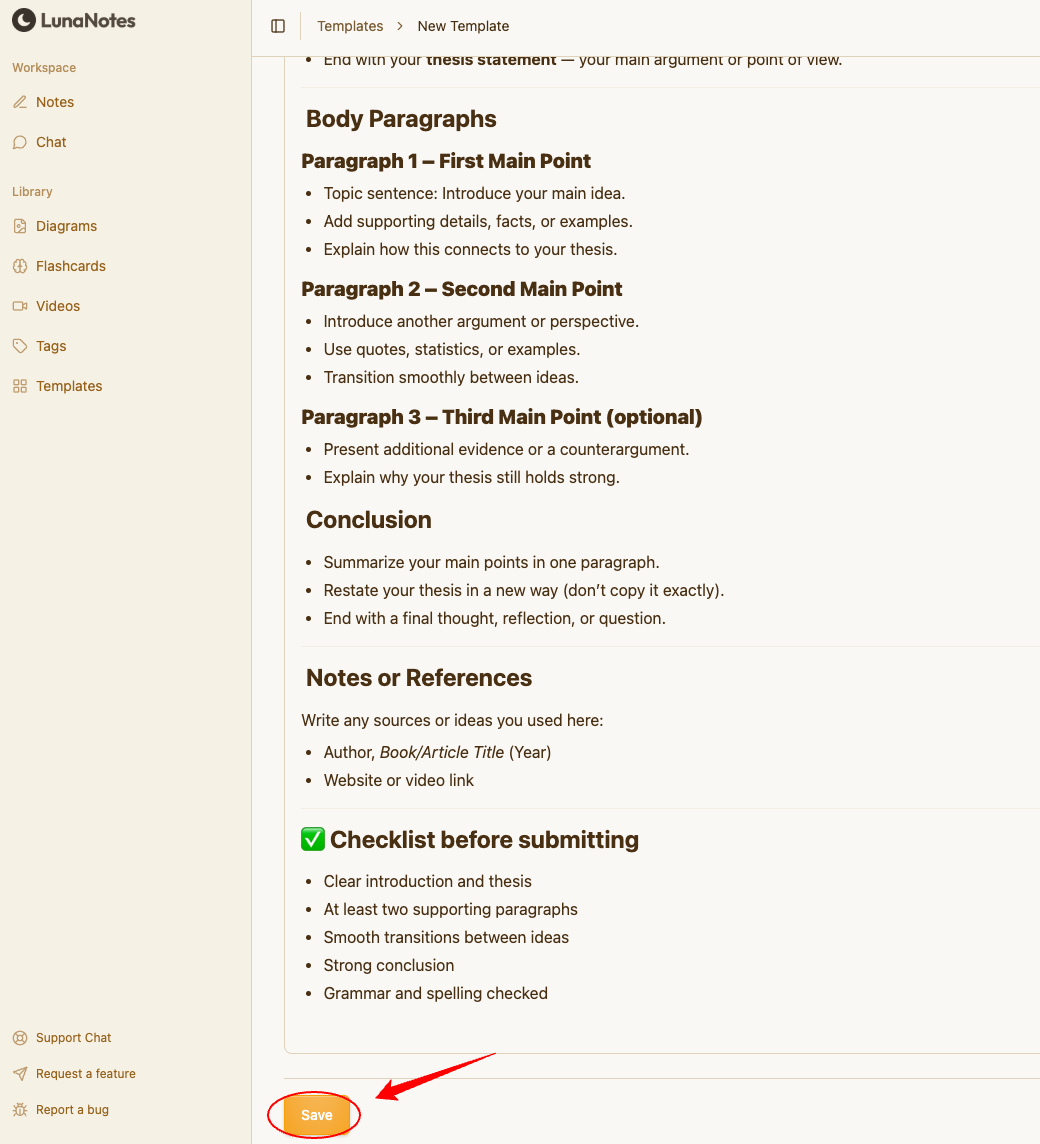 LunaNotes allows you to create and save custom templates so you can reuse your favorite note layouts anytime. Templates are perfect for organizing your workflow — whether you’re writing essays, research notes, meeting summaries, or study guides.