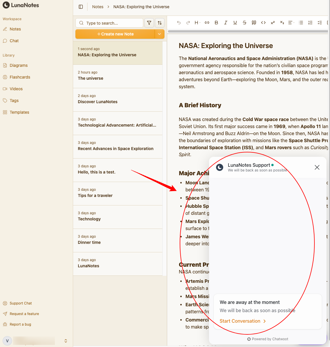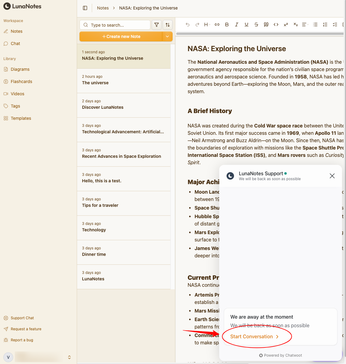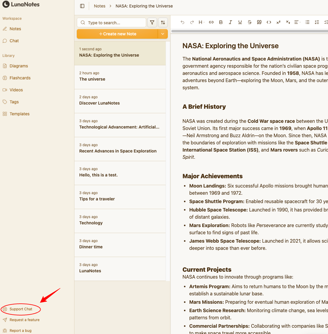 If you need help using LunaNotes, you can easily reach our Support Team through the in-app chat.