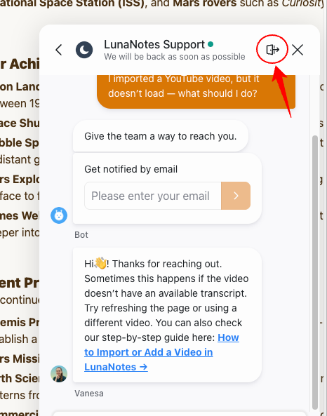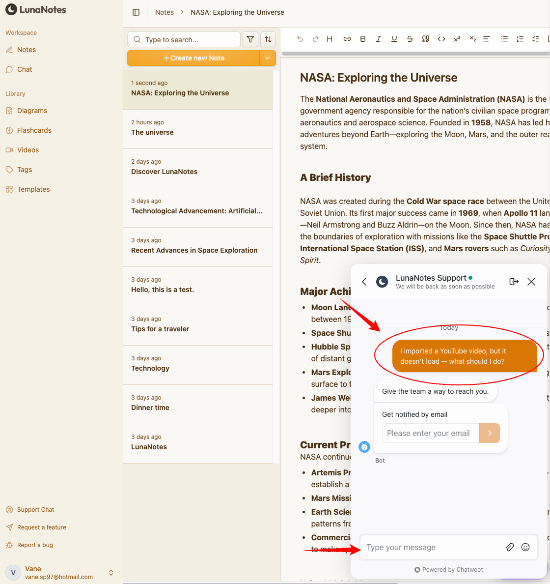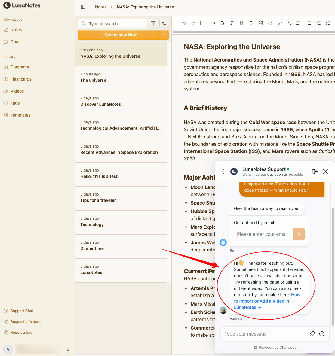 If you need help using LunaNotes, you can easily reach our Support Team through the in-app chat.