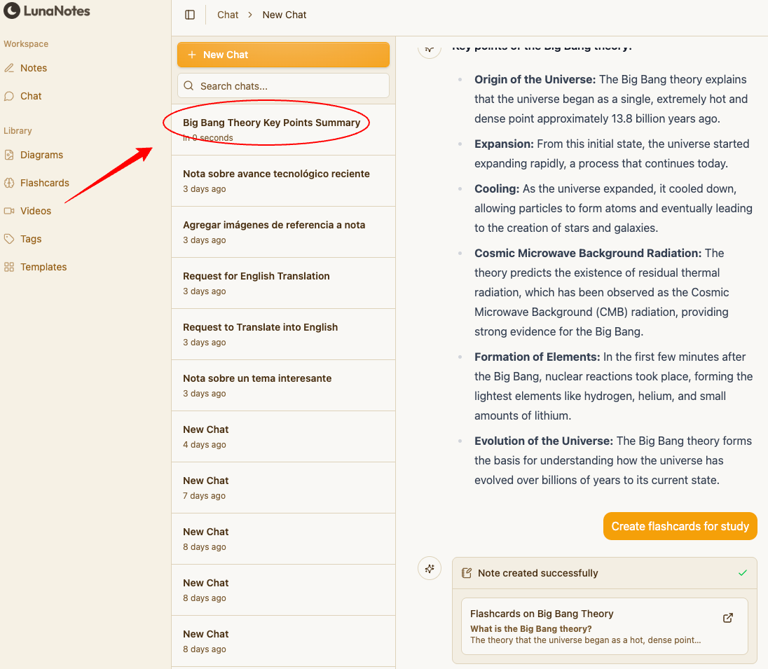 Unlike the in-note chat, this feature lives in its own workspace — accessible from the Chat section — where you can have longer, creative, or research-based conversations with the AI. You can use it to brainstorm ideas and outlines for essays or projects, ask questions about topics you’re studying, create new notes automatically from conversations, generate diagrams, flashcards, or summaries with a single click.