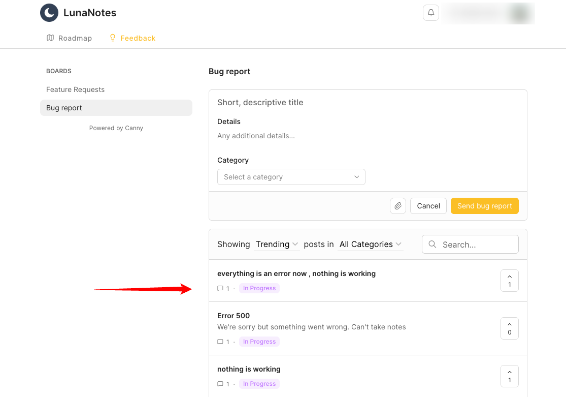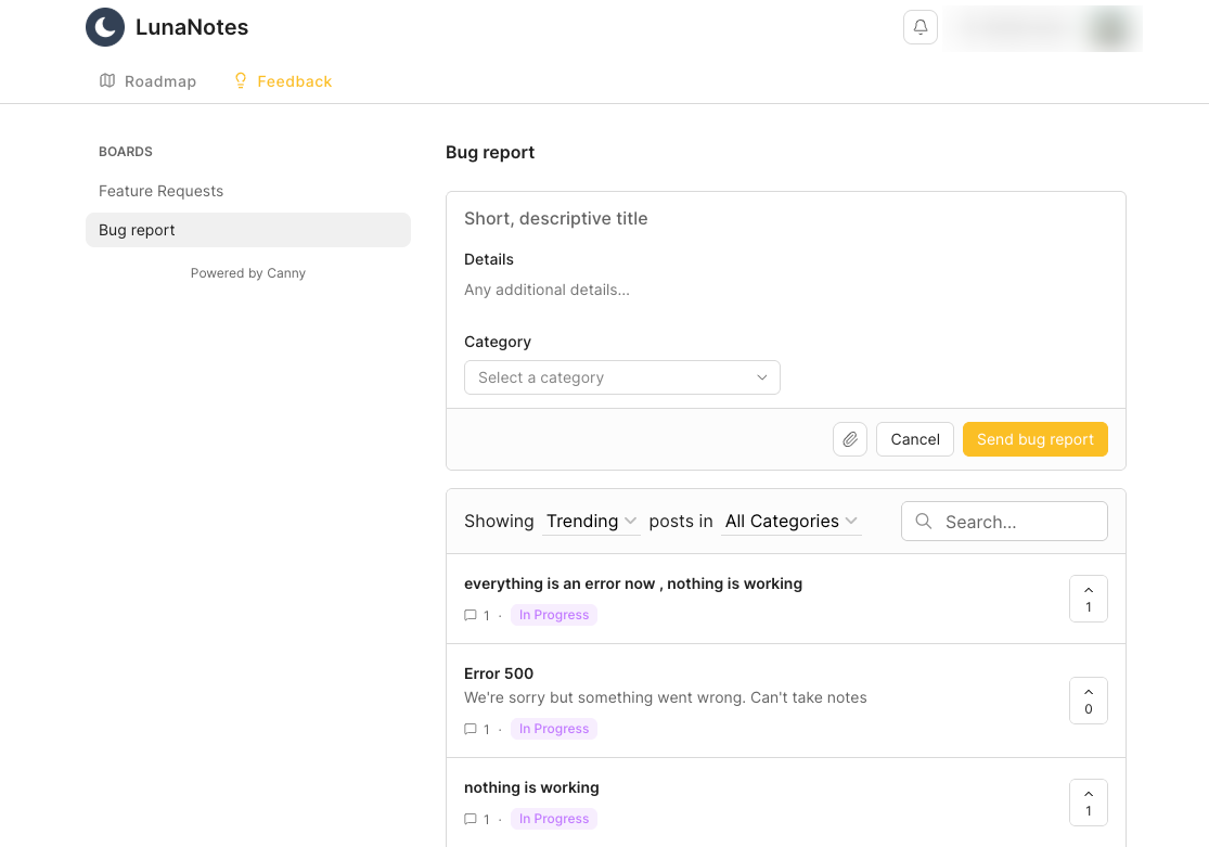 The LunaNotes team reviews every report, replies if more details are needed, and updates the post’s status when the issue is fixed.