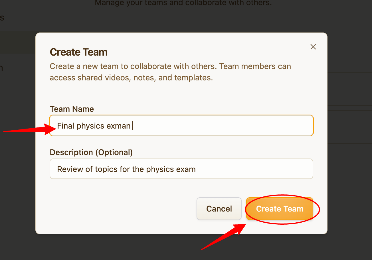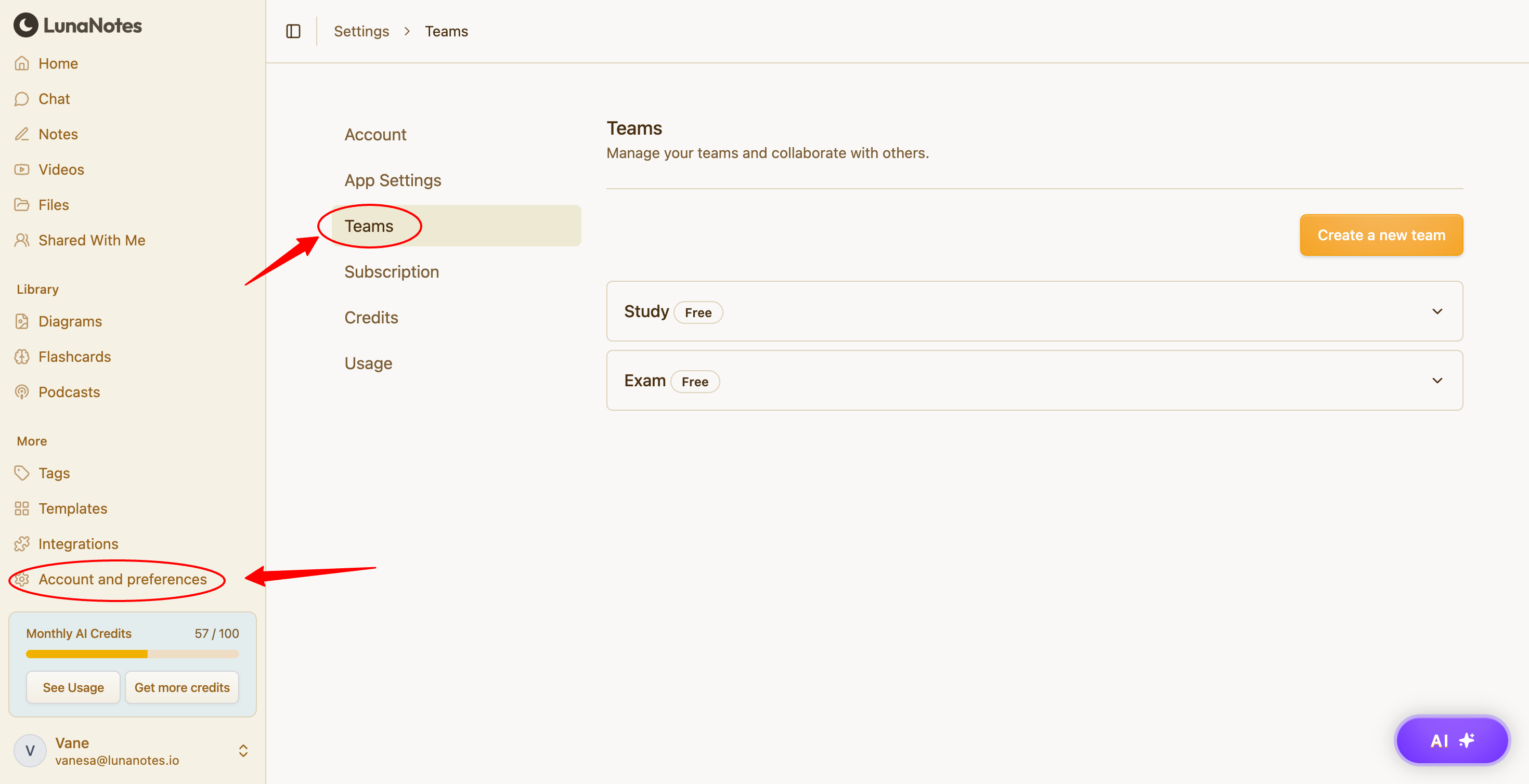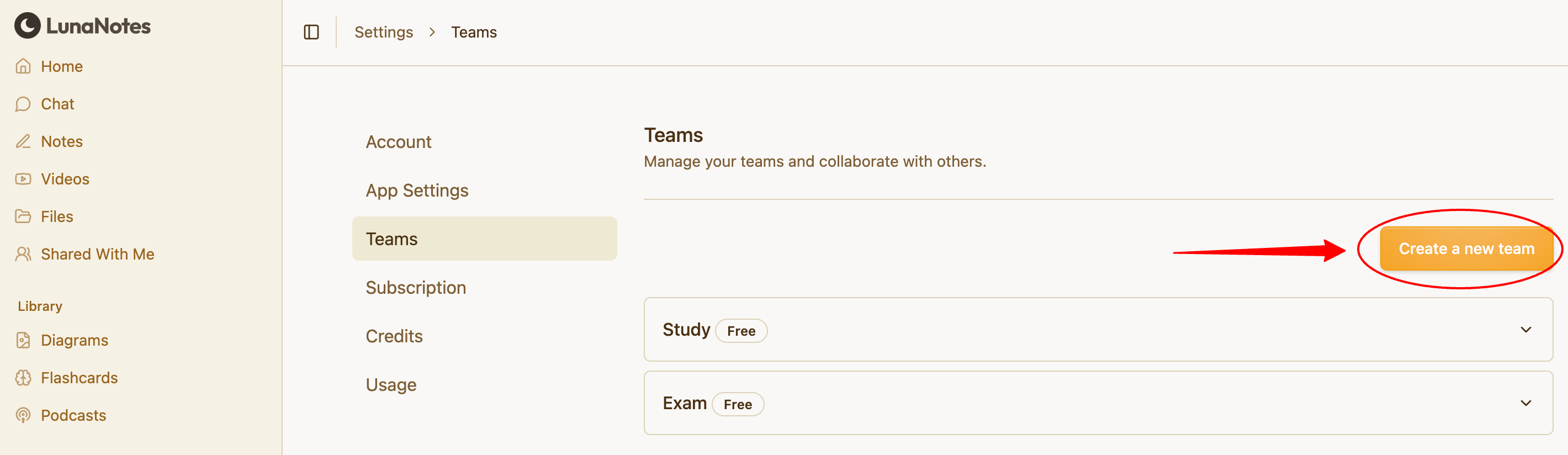 Teams allow you to collaborate by sharing notes and files with other members inside LunaNotes