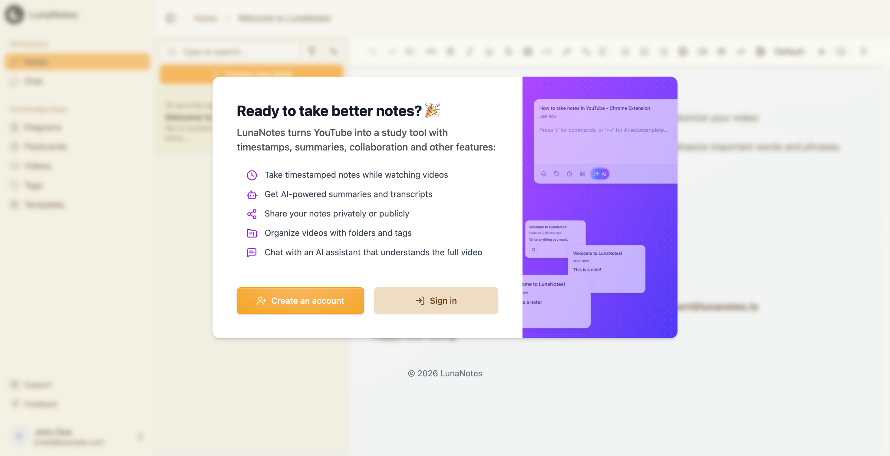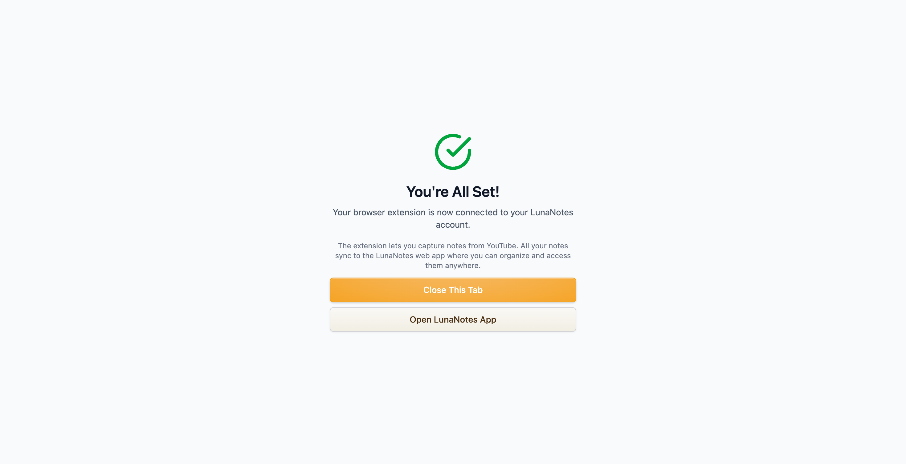 After this step, the extension will remain connected to your LunaNotes account, and you can start taking notes directly from YouTube.